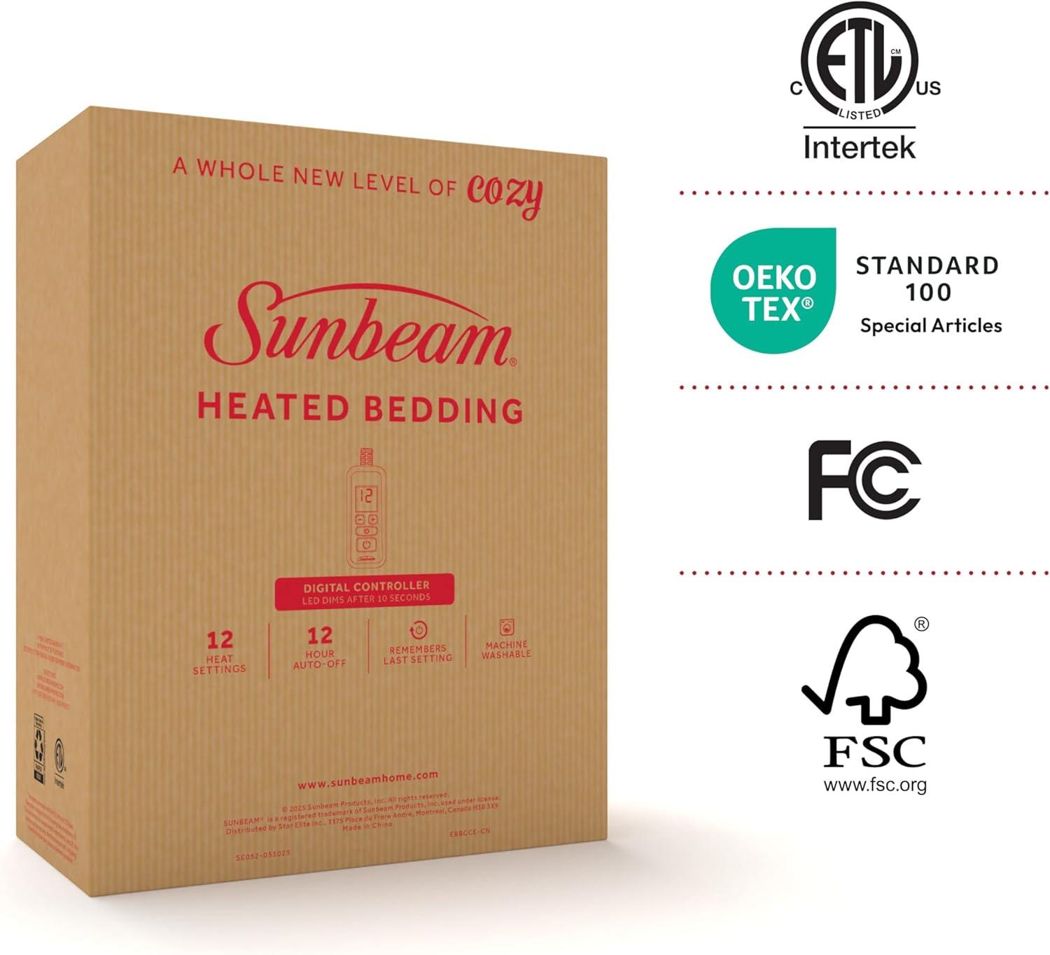 Sunbeam Electric Royal Luxe Microplush Heated Blanket wraps you in cozy warmth on chilly nights. Made from luxuriously soft microplush fabric, this blanket provides warmth and comfort all night long. The warm mushroom beige color complements a variety of bedroom décors with its soft, neutral tone, making this Full-size (84” x 72”) electric blanket a stylish and practical addition to your home. Equipped with a user-friendly dial controller, it offers 12 personalized heat settings, allowing you to find your perfect temperature. The 1 to 12-hour selectable auto shut-off feature provides added peace of mind, while the premium wire technology senses and adjusts for consistent and safe heat distribution. For easy maintenance, simply detach the controller and machine wash for long-lasting softness. Backed by over 125 years of Sunbeam’s innovation, this ETL-certified heated blanket ensures high-quality performance and safety.