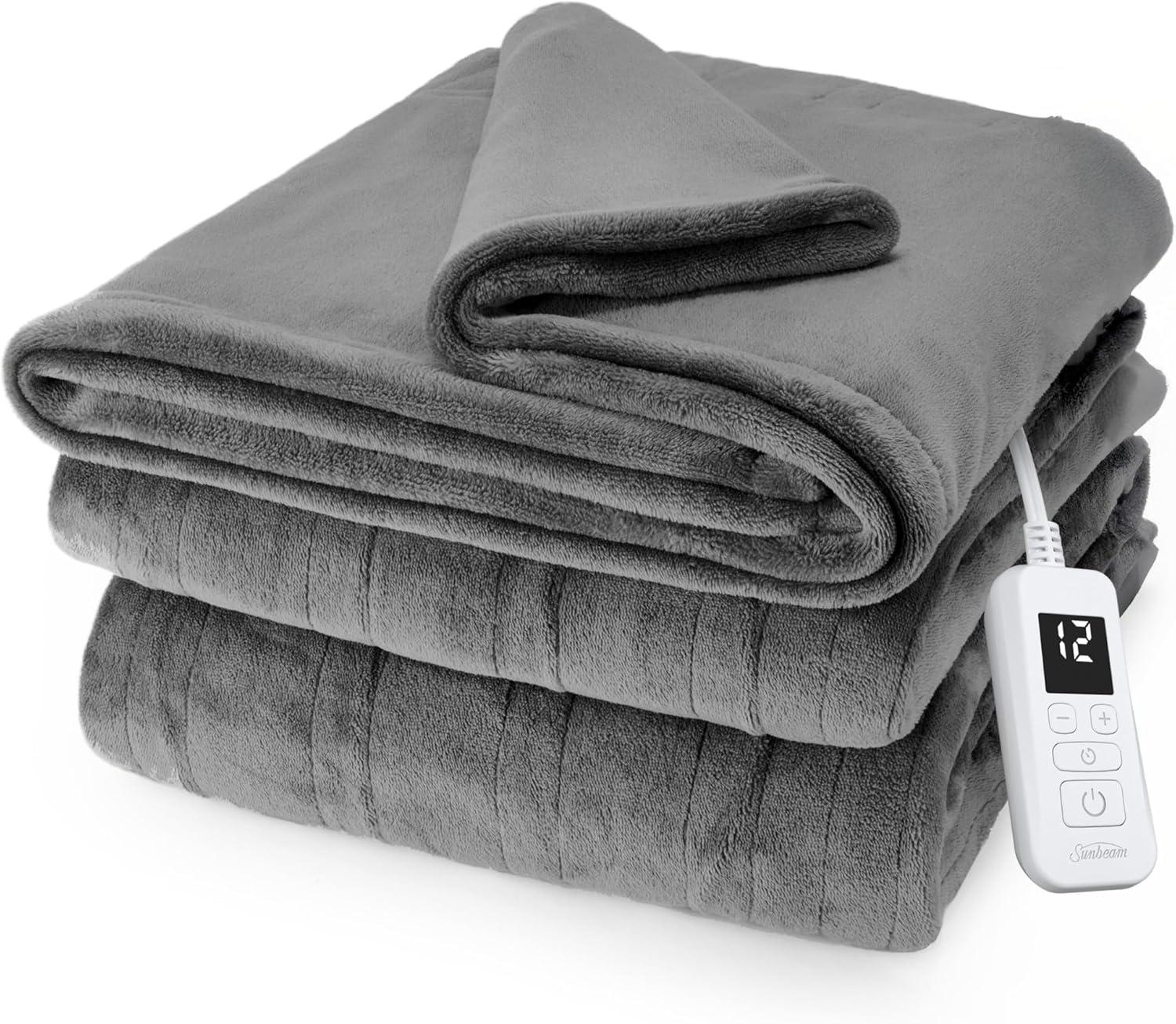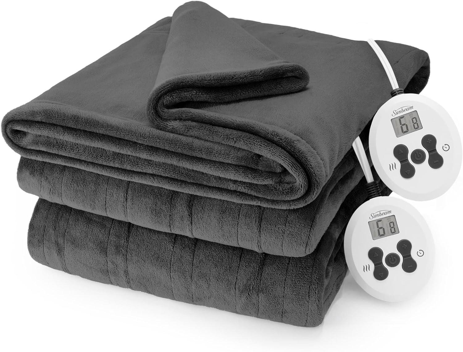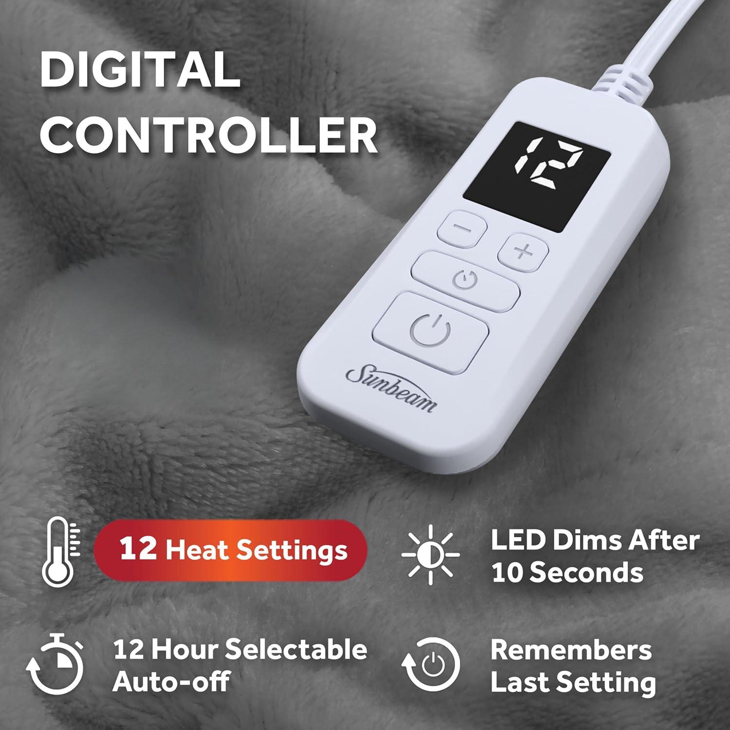 Sunbeam Royal Posh Velvet Heated Blanket snuggles you in cozy warmth on chilly nights. Experience the lush and silky royal posh velvet fabric to keep you warm and comfortable all night long. The Night Fog color enhances any bedroom decor, making this Full size (84” x 72″ ) electric blanket make a stylish and practical addition to your home. Features a user-friendly dial controller that offers 12 personalized heat settings, allowing you to find the perfect temperature for your warmth and comfort. Plus, a 1 to 12-hour selectable auto shut-off function for added peace of mind. The heated wires are made with premium components developed with a wire technology that senses and adjusts for continuous heat and safe operation. When ready to clean, simply detach the controller from the blanket and place into the washing machine and dryer for easy care, stays silky soft wash after wash. Sunbeam is an American brand with more than 125 years of history in electric home appliances. All Sunbeam electric bedding products are ETL certified.